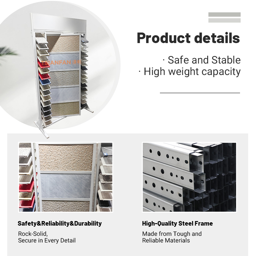 Quality is a top priority in every aspect of the rack’s design and production. Built with high-grade, corrosion-resistant steel frames and scratch-proof surfaces, it offers exceptional durability to withstand the wear and tear of high-traffic environments like showrooms and retail stores. The stable floor-standing base ensures the rack remains secure even when fully loaded with heavy stone samples, while the smooth rotating mechanism operates quietly and reliably, enhancing the overall user experience. TsianFan’s strict quality control process – covering raw material inspection, production monitoring, and final product testing – guarantees that each rack meets the highest industry standards, reflecting the company’s commitment to delivering “durable, high-performance solutions.”